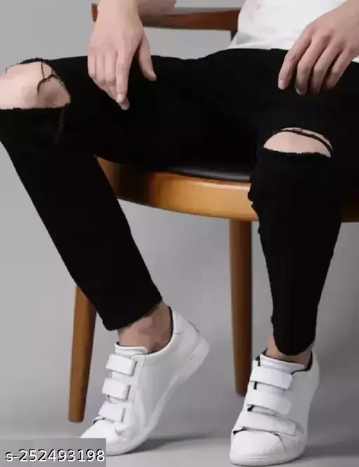 Fashionista Gorgeous and Stylish Knee Ripped Skinny Ankle Length Black Jeans for Men (Tapered Bottom with Damage & Distressed Knee Cut)
