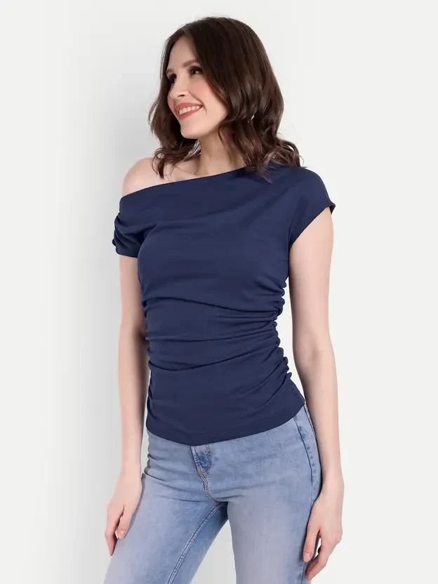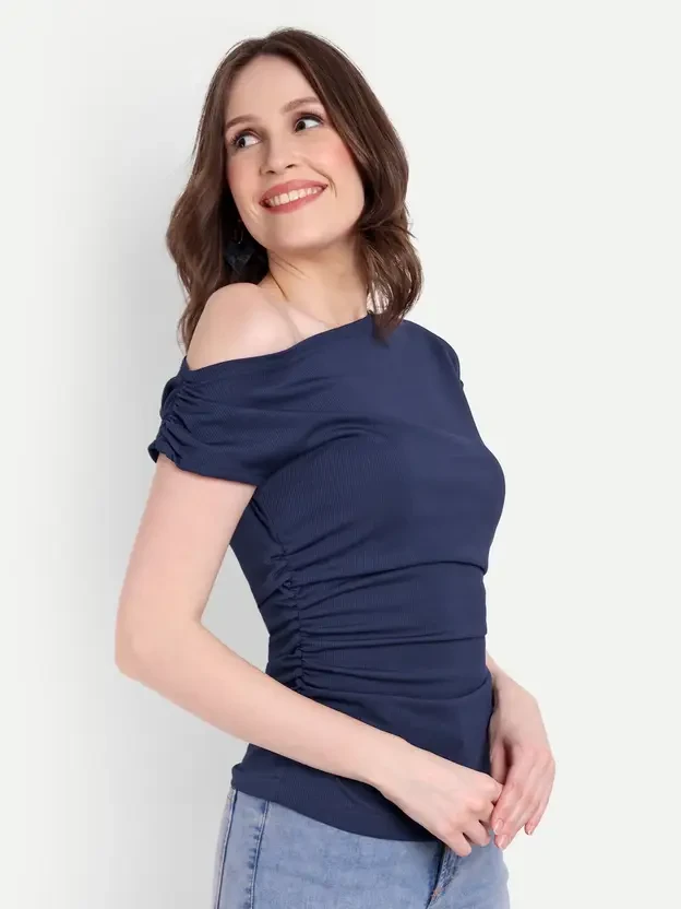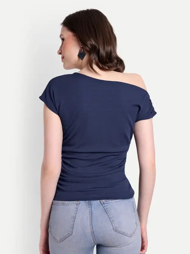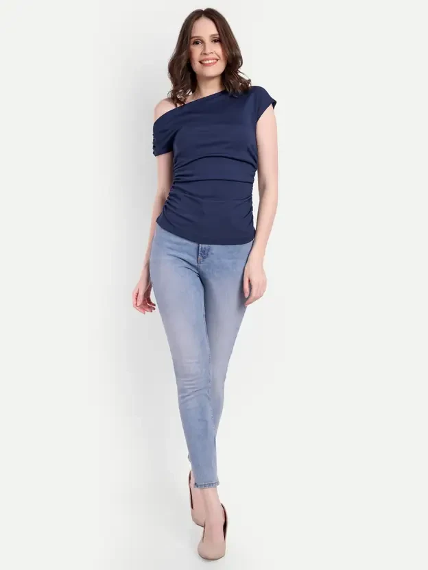 ck One Shoulder Neck Sleeve Style Regular Sleeves Fit Regular Fabric Net Type Regular Top Pattern Solid Color Dark Blue