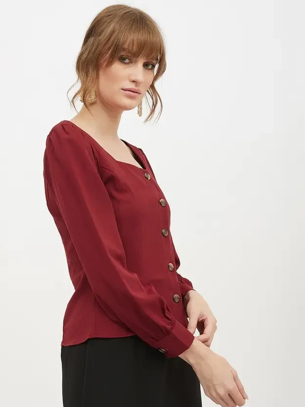 Maroon Solid woven regular Top, has a Square Neck With, Full Sleeve