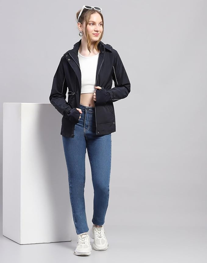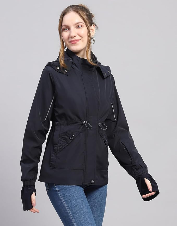 Women's Solid Black Detachable Hood Full Sleeve Jacket