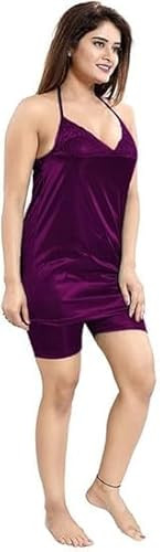 Women's Nighty Purple Satin with Bra Panty